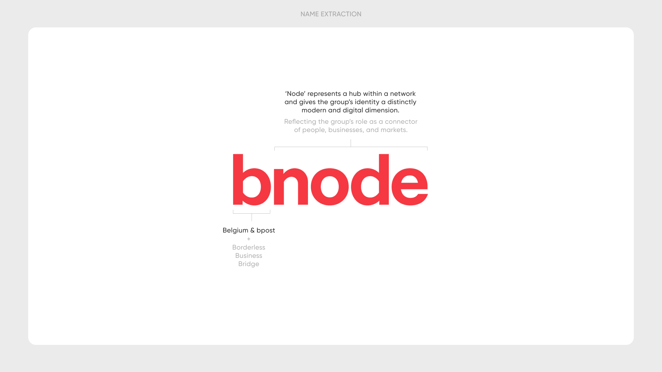Working closely with the bpostgroup team, we guided a strategic naming process that focused on positioning, language and international applicability. The result was bnode: a name that makes the group's transformation tangible without denying its roots. bnode combines the past and the future in one name.