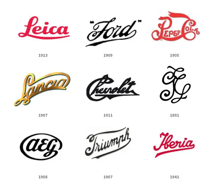 For example, many well-known brands from the early 20th century have very similar fonts. In the overview, we see brands like Leica, Ford, Pepsi, Lancia, Chevrolet, General Electric, AEG, Triumph or Iberia.